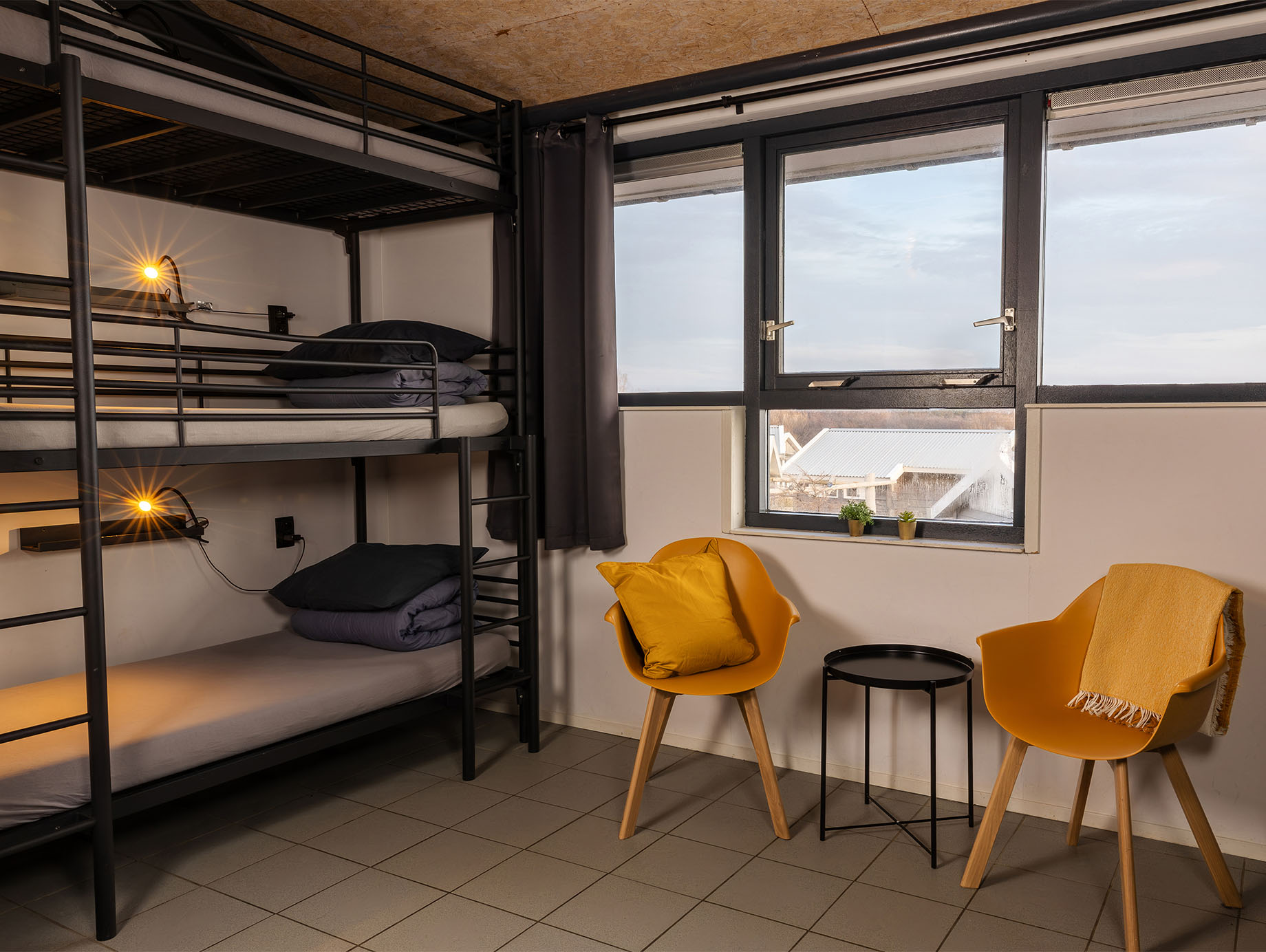 Deze Budget Room van 24 m² bevindt zich op de eerste verdieping en is praktisch ingericht met drie stapelbedden van drie hoog, geschikt voor maximaal acht tot negen personen. Een open vakkenkast biedt ruimte voor het opbergen van kleine persoonlijke spullen.