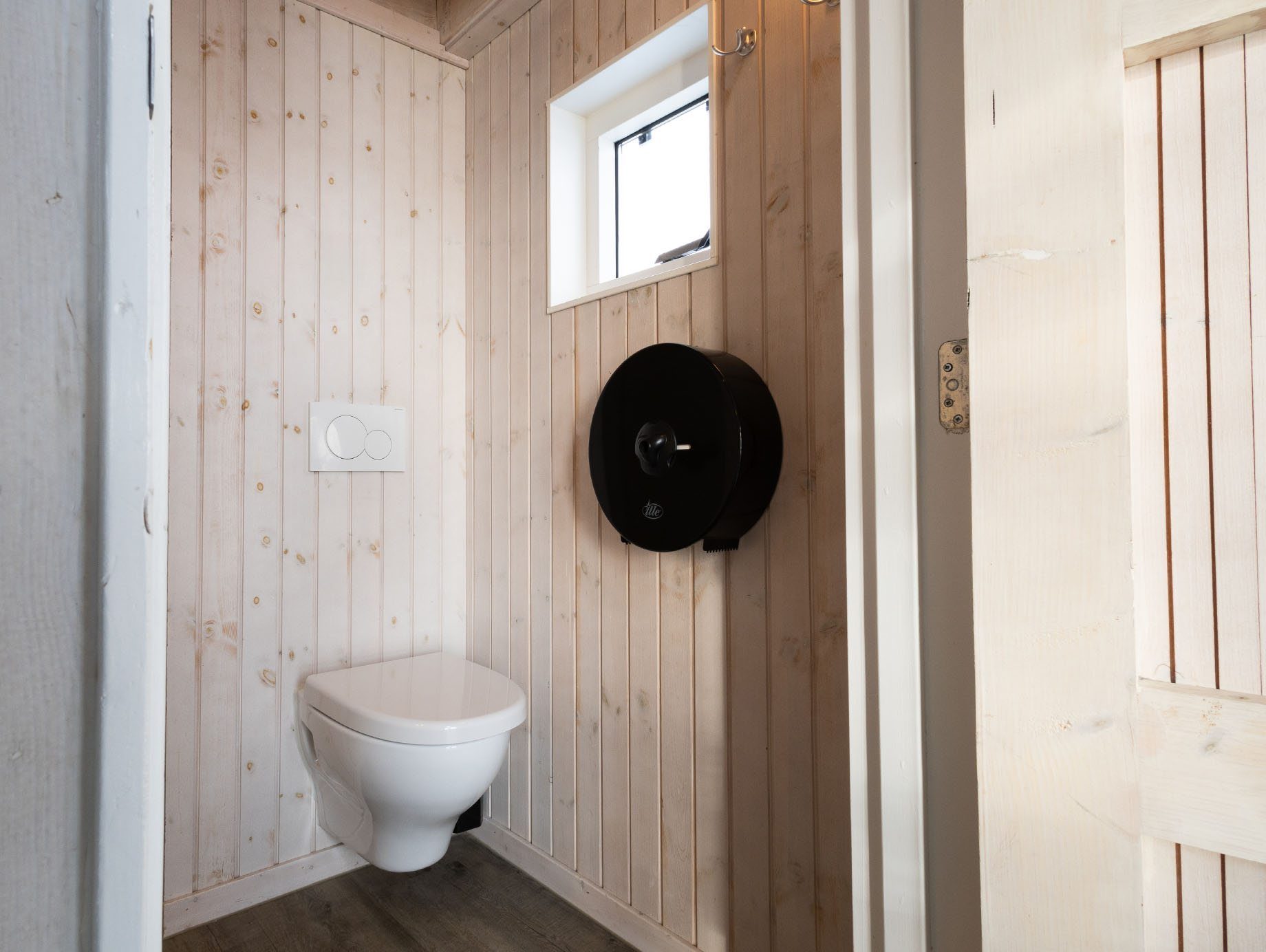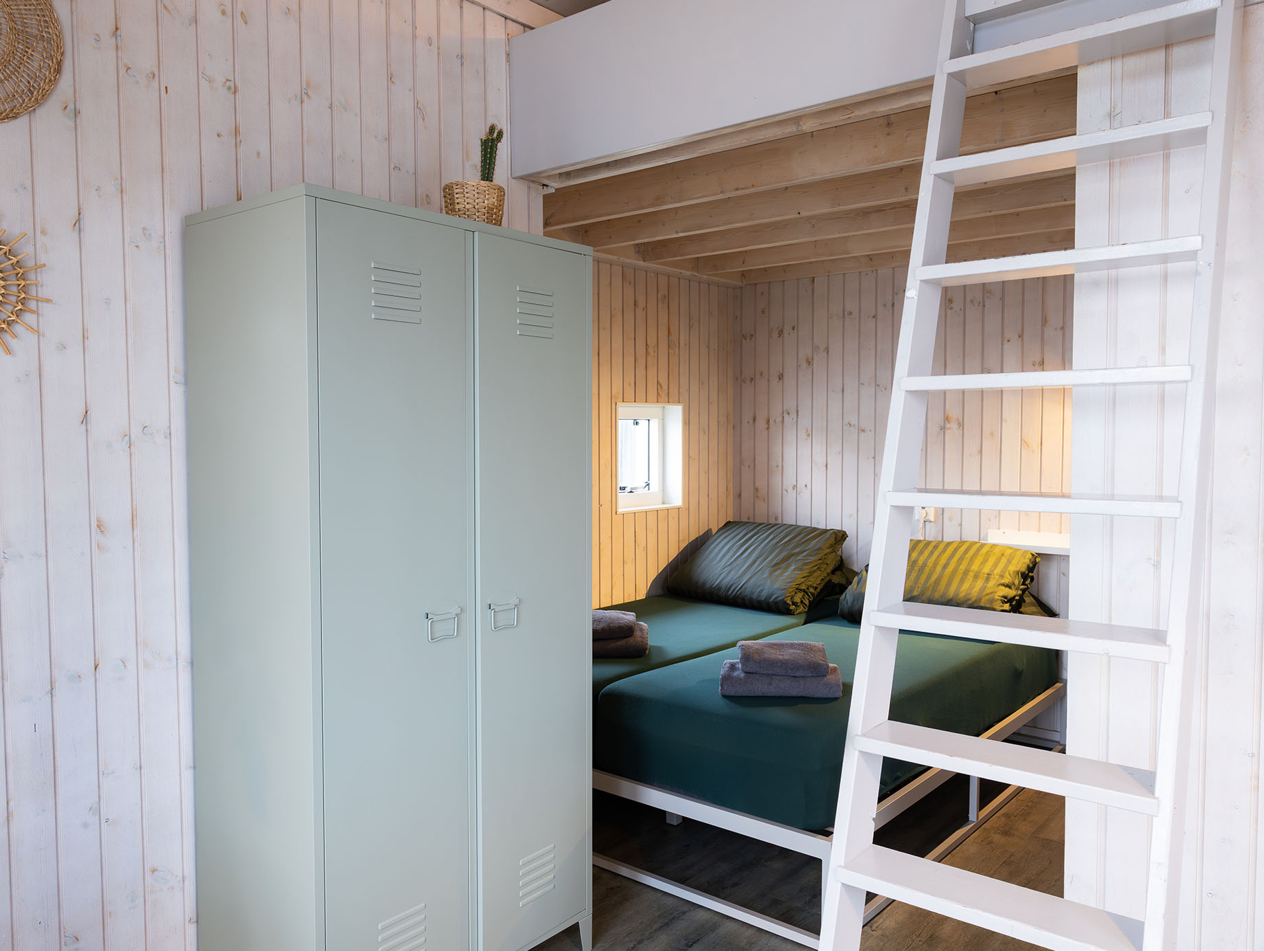 Via het eigen houten terras wordt door de openslaande deuren de lichte living betreden, ingericht met een eettafel, vier stoelen en een loungestoel die desgewenst ook buiten geplaatst kan worden. Achter het zitgedeelte bevindt zich een open slaapruimte met een comfortabel tweepersoonsbed met twee eenpersoonsmatrassen. Via de trapladder is de vide bereikbaar, waar twee eenpersoonsbedden extra slaapruimte bieden. In de metalen kast is ruimte voor het opbergen van kleine persoonlijke spullen.