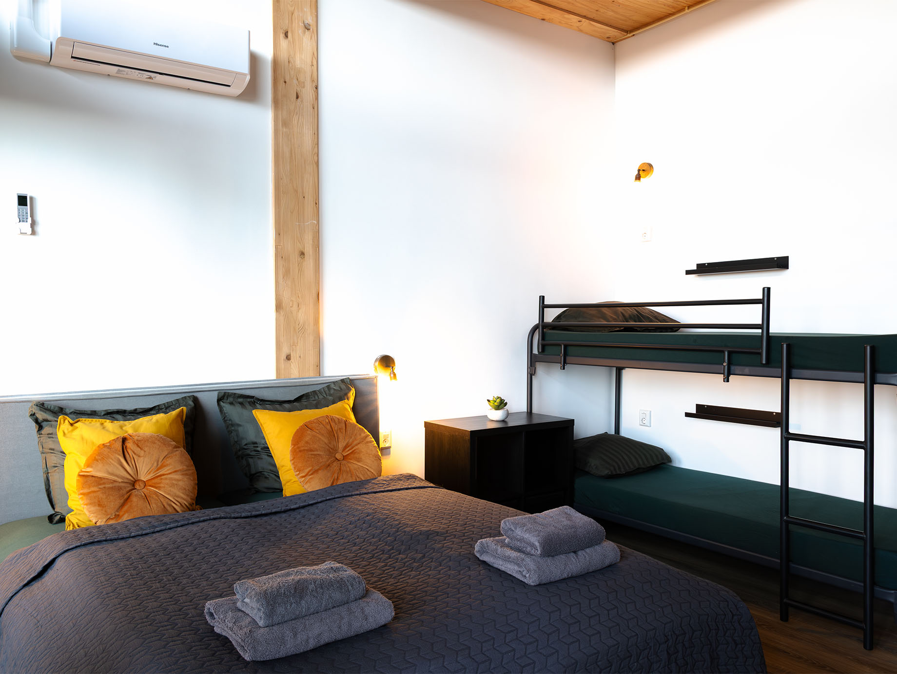 De kamer op de eerste verdieping is ingericht met een tweepersoons boxspring met eenpersoonsmatrassen en een stapelbed. Daarnaast is er een zitje met twee stoelen, een salontafel en een open kledingrek aanwezig. Achter de houten schuifdeur bevindt zich de moderne badkamer met douche, toilet en twee wastafels.