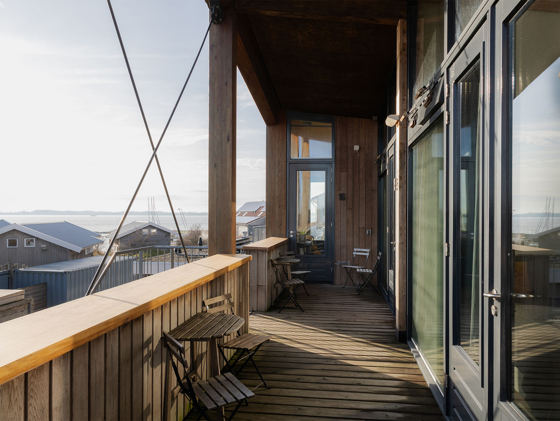 De ruimte beschikt over een zitje met twee stoelen, een salontafeltje en een open kledingrek. Achter de houten schuifdeur bevindt zich de moderne badkamer met douche, toilet en twee wastafels.