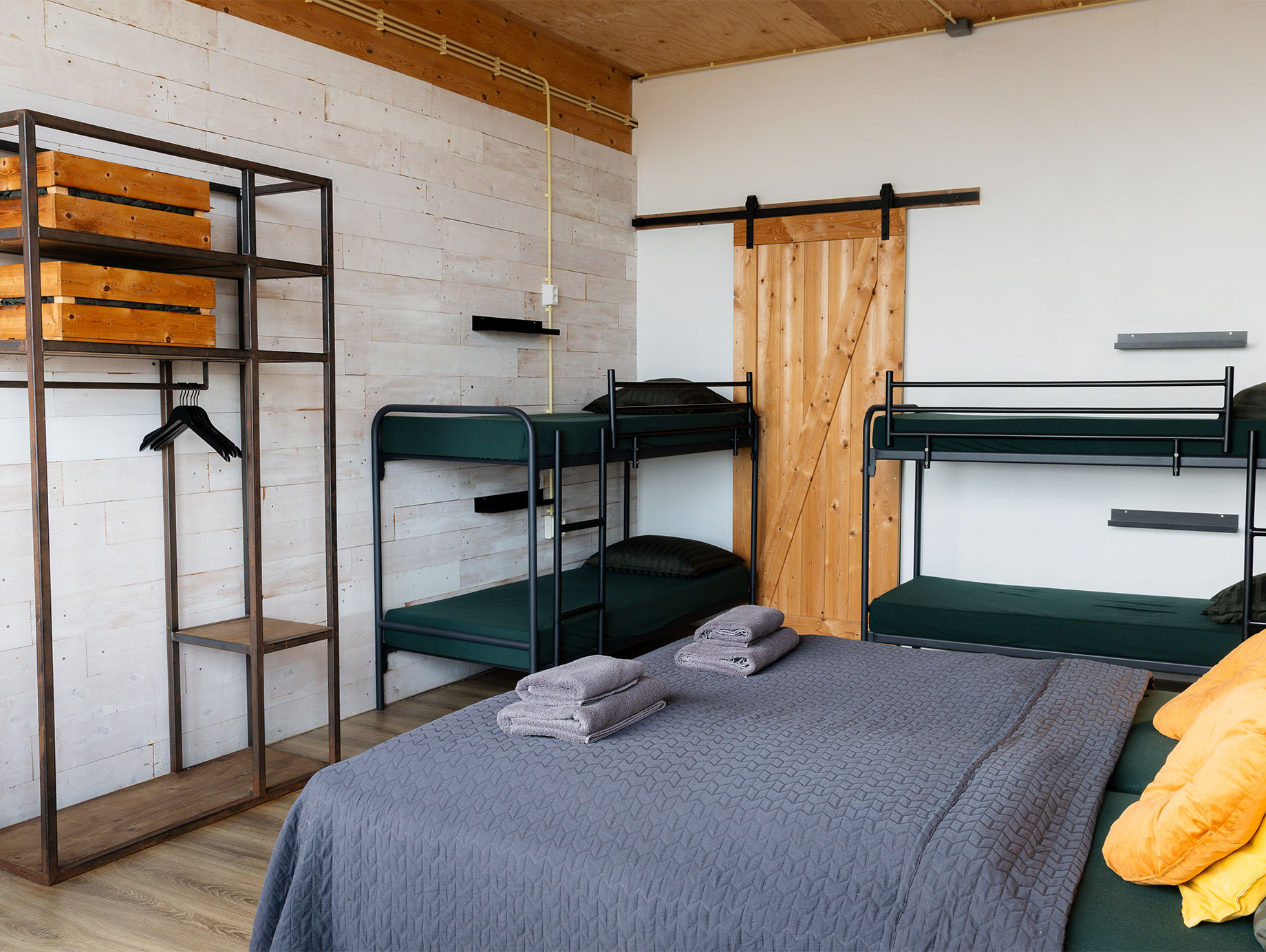 Deze Lake Room van 29 m² biedt een lichte en ruimtelijke sfeer dankzij het hoge plafond en de grote raampartijen. De kamer bevindt zich op de eerste verdieping en is ingericht met een tweepersoonsbed met eenpersoonsmatrassen en twee stapelbedden, geschikt voor families of vrienden die samen reizen.