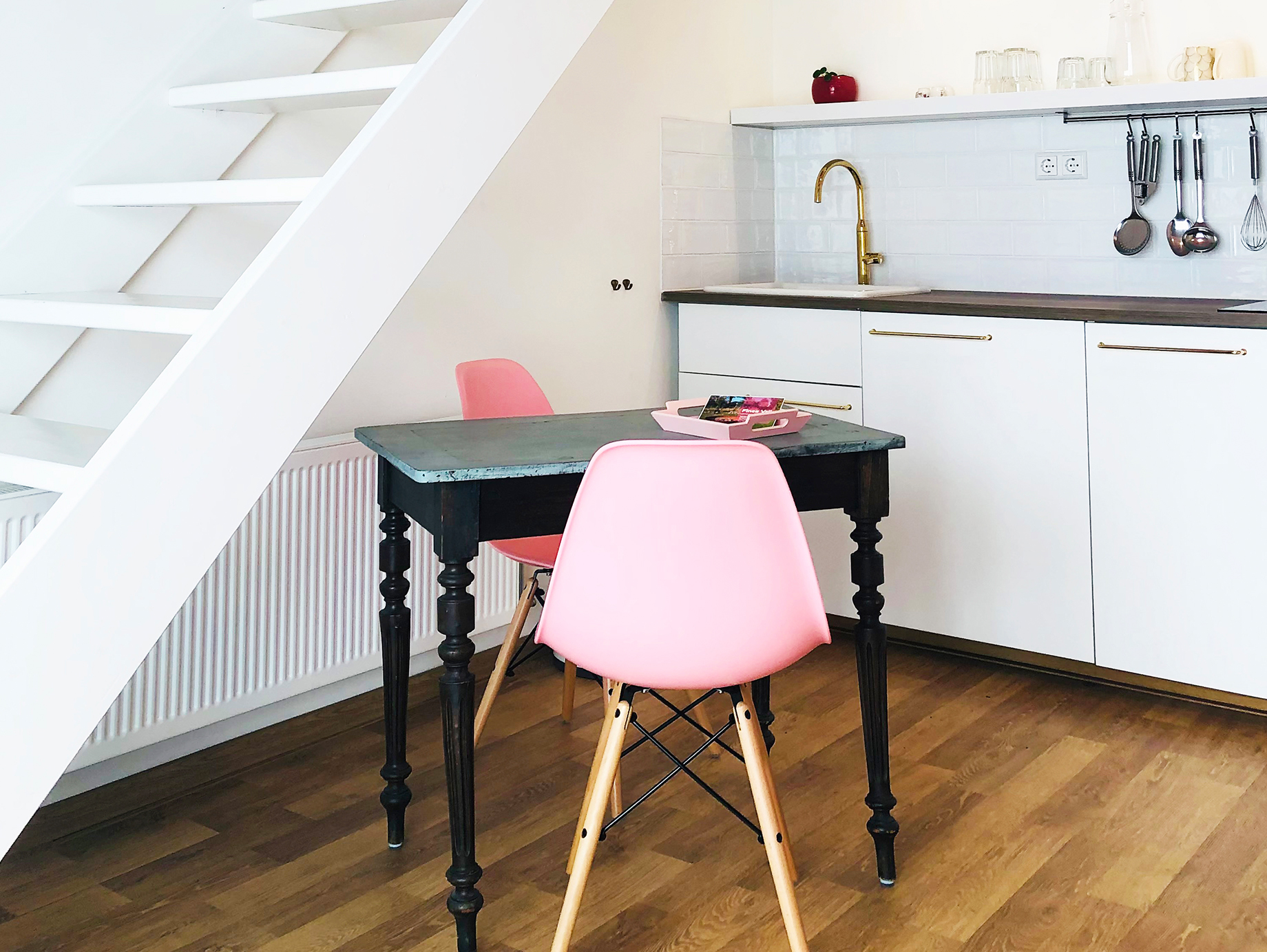 • Een volledig ingerichte keuken met keukendoeken, keukengerei, servies, 2-pits kookplaat, koelkast, koffiezetapparaat en waterkoker
