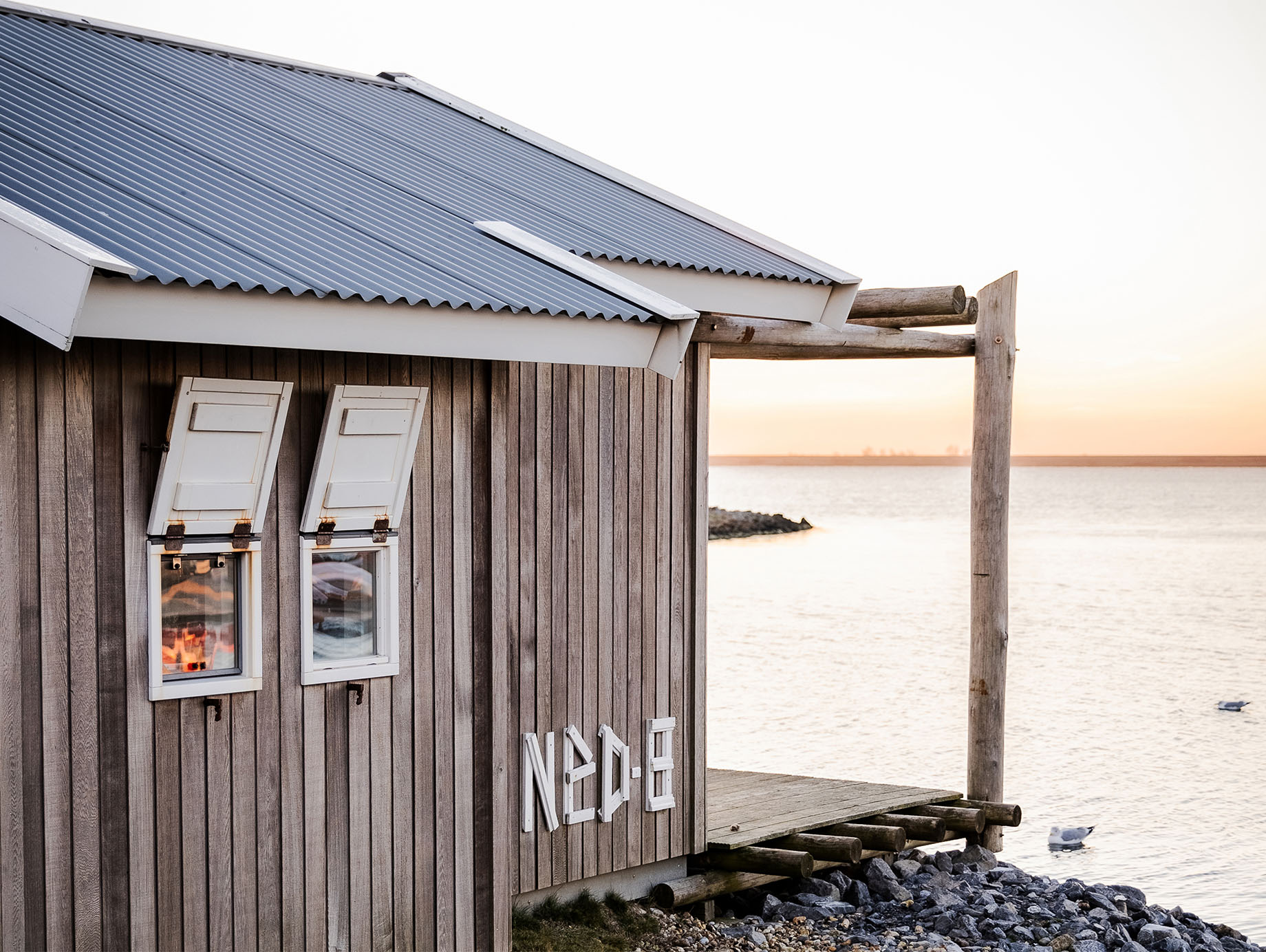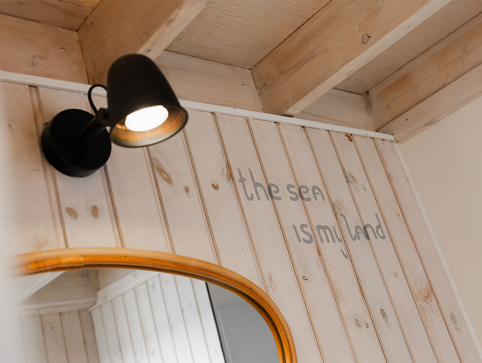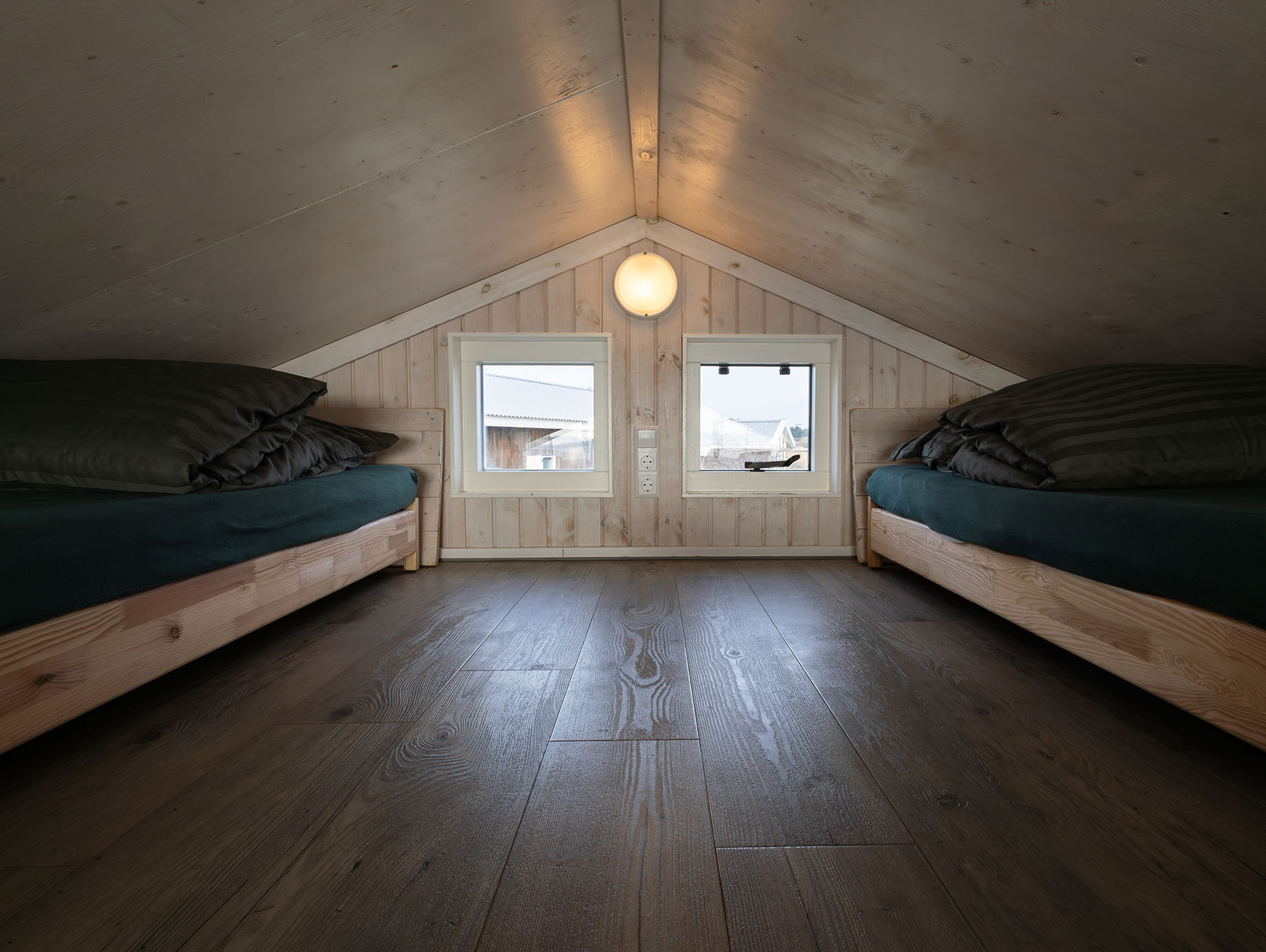 Via het eigen houten terras wordt door de openslaande deuren de lichte living betreden, ingericht met een eettafel, vier stoelen en een loungestoel die desgewenst ook buiten geplaatst kan worden. Achter het zitgedeelte bevindt zich een open slaapruimte met een comfortabel tweepersoonsbed met twee eenpersoonsmatrassen. Via de trapladder is de vide bereikbaar, waar twee eenpersoonsbedden extra slaapruimte bieden. In de metalen kast is ruimte voor het opbergen van kleine persoonlijke spullen.