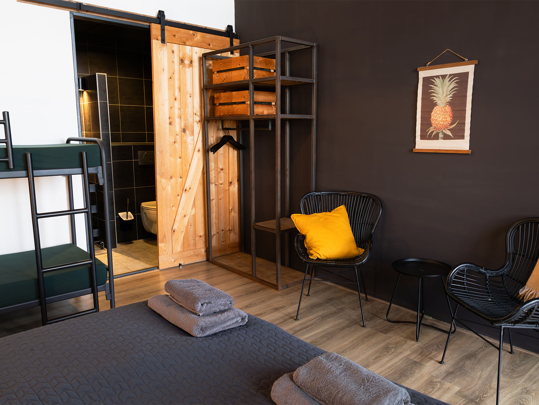 De kamer op de eerste verdieping is ingericht met een tweepersoons boxspring met eenpersoonsmatrassen en een stapelbed. Daarnaast is er een zitje met twee stoelen, een salontafel en een open kledingrek aanwezig. Achter de houten schuifdeur bevindt zich de moderne badkamer met douche, toilet en twee wastafels.