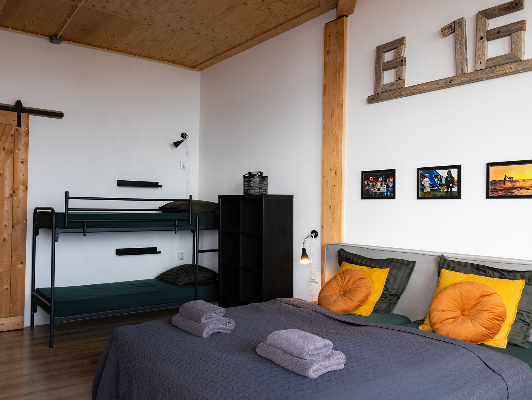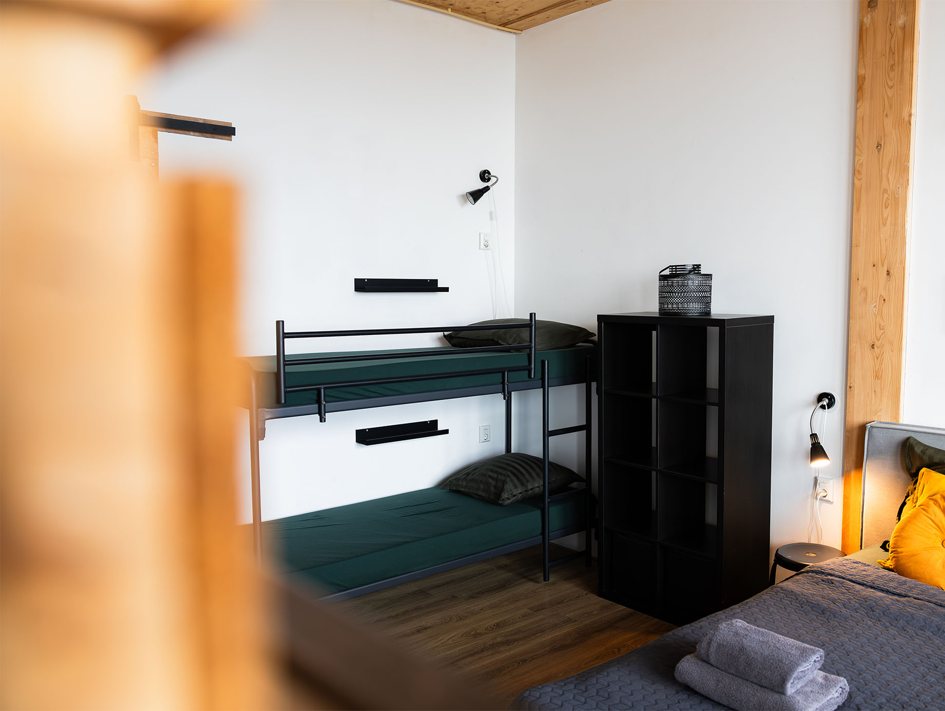 Deze Lake Room van 29 m² biedt een lichte en ruimtelijke sfeer dankzij het hoge plafond en de grote raampartijen. De kamer bevindt zich op de eerste verdieping en is ingericht met een tweepersoonsbed met eenpersoonsmatrassen en twee stapelbedden, geschikt voor families of vrienden die samen reizen.